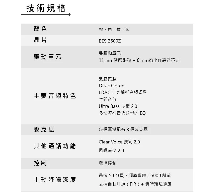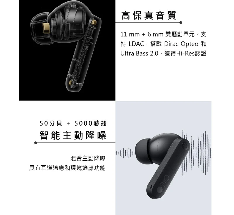 .最佳50分貝 + 5000赫茲智能主動降噪